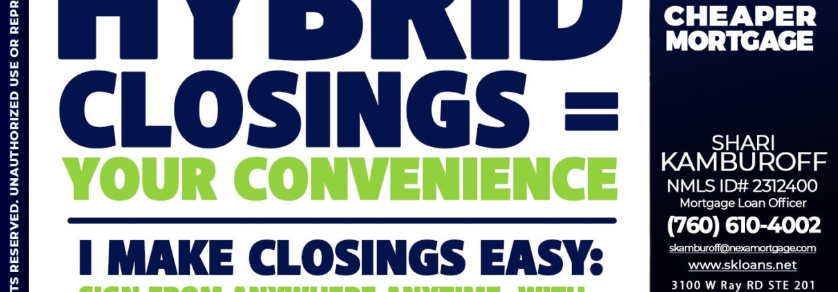 HYBRID CLOSINGS - Shari Kamburoff -Mortgage Loan OfficerHi, my name is Shari Kamburoff. I’m a Loan Officer with NEXA Mortgage LLC., offering personalized mortgage solutions, fast customized quotes, great rates and service with integrity.