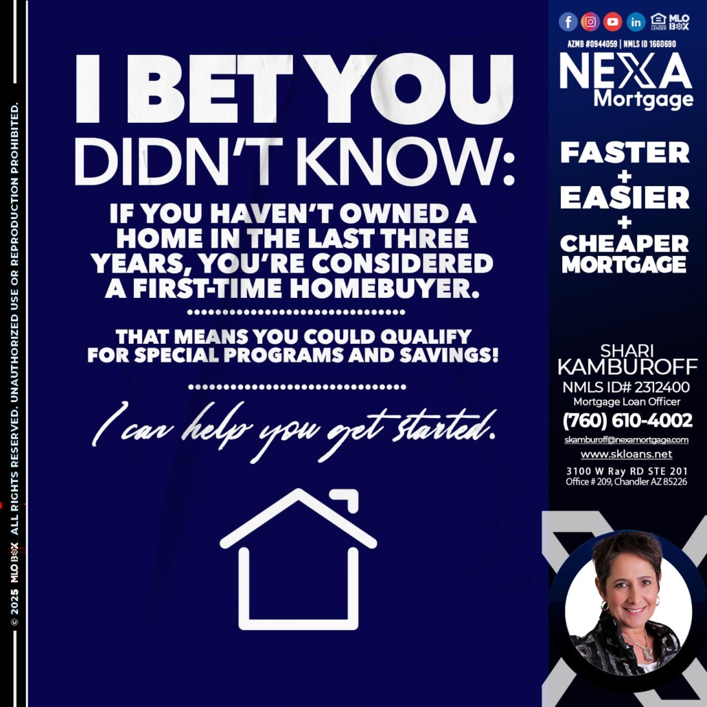 I BET YOU KNOW - Shari Kamburoff -Mortgage Loan OfficerHi, my name is Shari Kamburoff. I’m a Loan Officer with NEXA Mortgage LLC., offering personalized mortgage solutions, fast customized quotes, great rates and service with integrity.