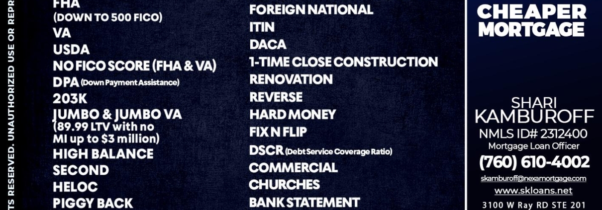 Hi, my name is Shari Kamburoff. I’m a Loan Officer with NEXA Mortgage LLC., offering personalized mortgage solutions, fast customized quotes, great rates and service with integrity.