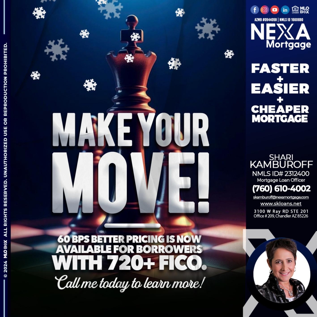 MAKE YOUR MOVE - Shari Kamburoff -Mortgage Loan OfficerHi, my name is Shari Kamburoff. I’m a Loan Officer with NEXA Mortgage LLC., offering personalized mortgage solutions, fast customized quotes, great rates and service with integrity.