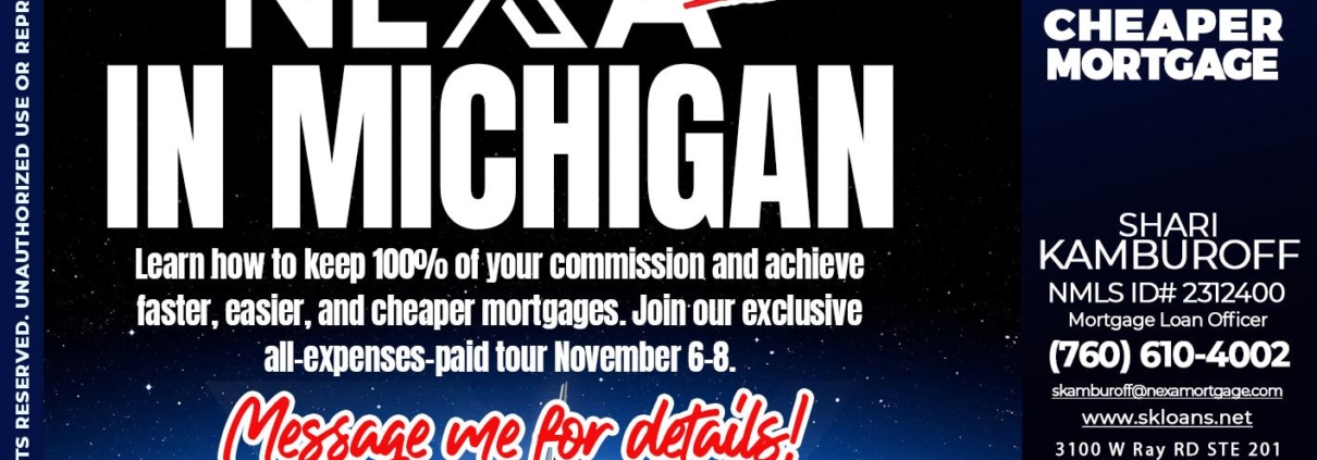 MICHIGAN TRIP NEXA 100 - Shari Kamburoff -Mortgage Loan OfficerHi, my name is Shari Kamburoff. I’m a Loan Officer with NEXA Mortgage LLC., offering personalized mortgage solutions, fast customized quotes, great rates and service with integrity.