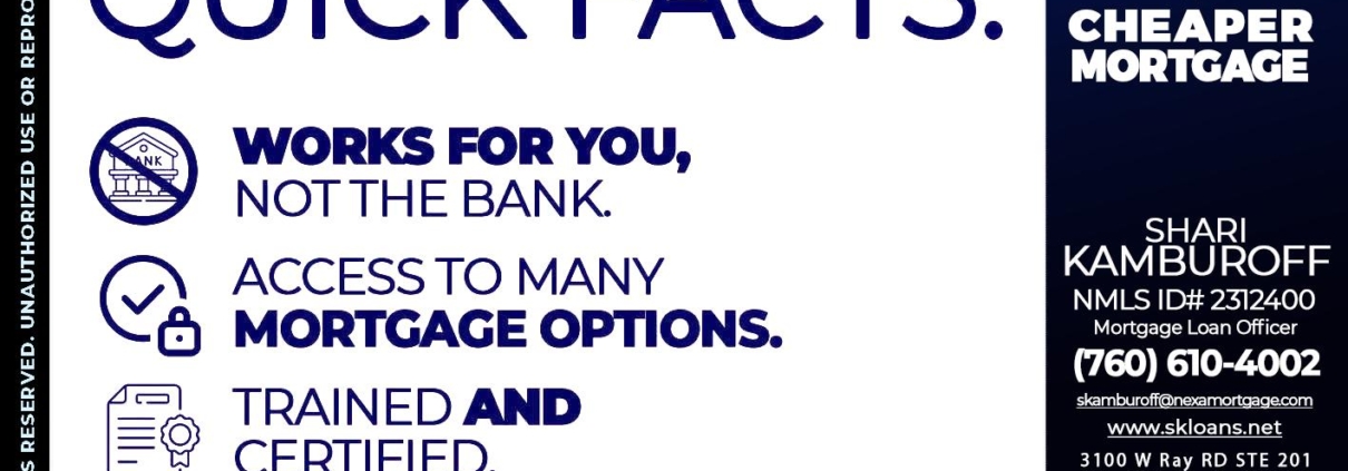 Hi, my name is Shari Kamburoff. I’m a Loan Officer with NEXA Mortgage LLC., offering personalized mortgage solutions, fast customized quotes, great rates and service with integrity.
