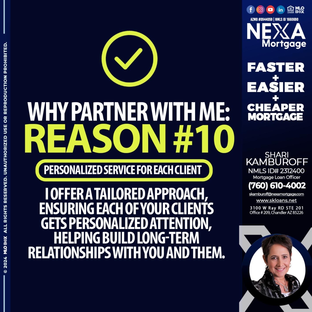 Hi, my name is Shari Kamburoff. I’m a Loan Officer with NEXA Mortgage LLC., offering personalized mortgage solutions, fast customized quotes, great rates and service with integrity.