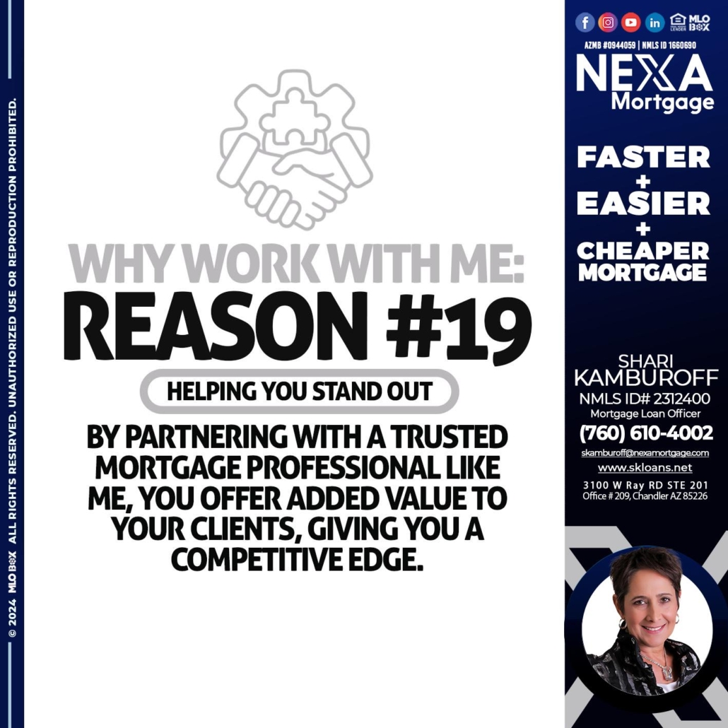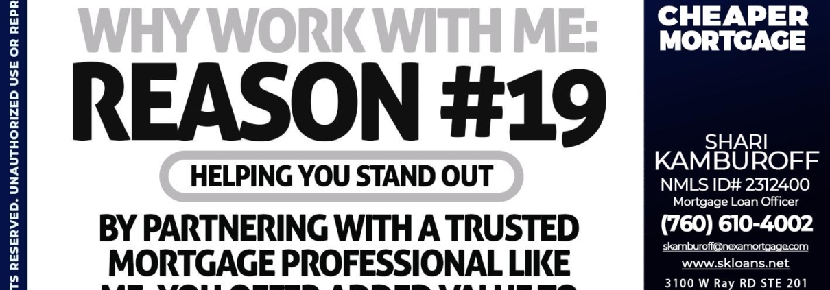 Hi, my name is Shari Kamburoff. I’m a Loan Officer with NEXA Mortgage LLC., offering personalized mortgage solutions, fast customized quotes, great rates and service with integrity.