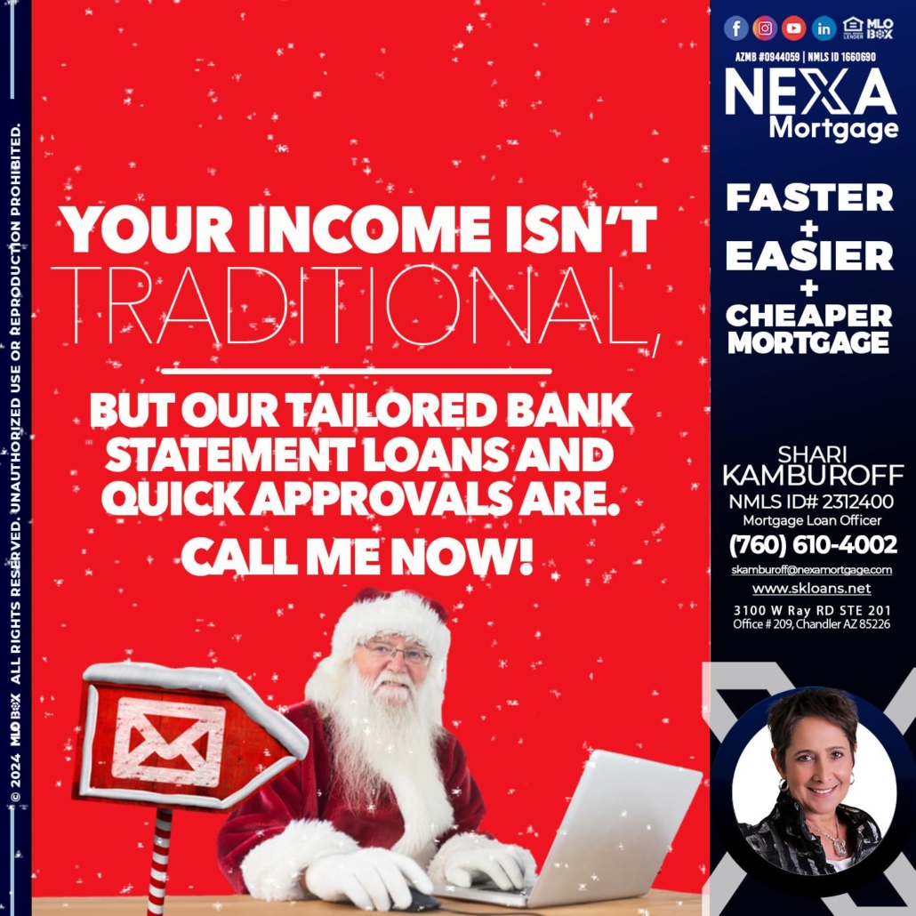Hi, my name is Shari Kamburoff. I’m a Loan Officer with NEXA Mortgage LLC., offering personalized mortgage solutions, fast customized quotes, great rates and service with integrity.